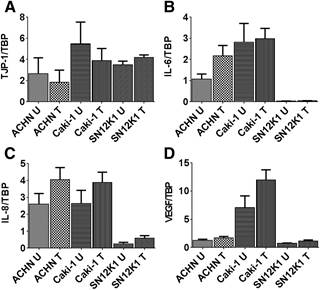 Figure 4. Lack of effect of maslinic acid on markers of RCC progression. Analysis of TJP-1 (A), the IL-6 (B), IL-8 (C), and VEGF (D) did not show any significant changes in response to maslinic acid. These results further confirm that the primary effect of maslinic acid on RCC cell lines is inhibition of proliferation. U: untreated; T: treated with maslinic acid.